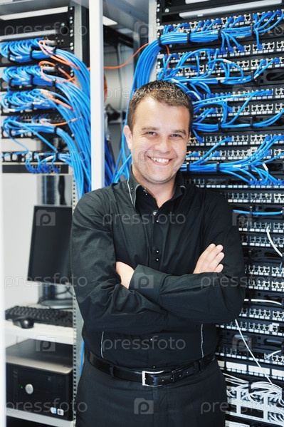 Молодой инженер в помещении с сервером в центре обработки данных