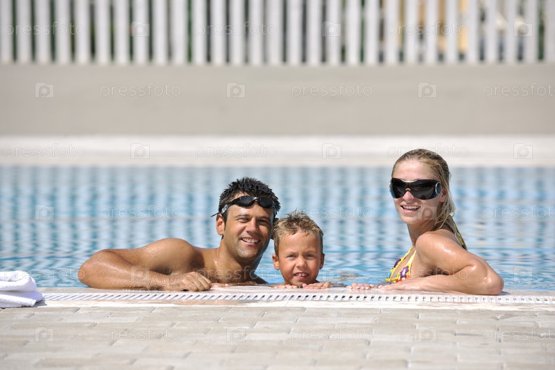 Счастливая семья в плавательном бассейне на открытом воздухе