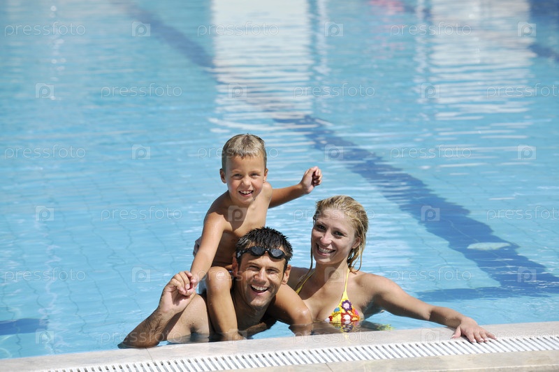Счастливая семья в плавательном бассейне на открытом воздухе