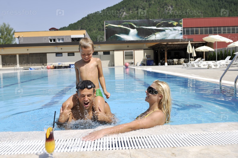 Счастливая молодая семья в бассейне