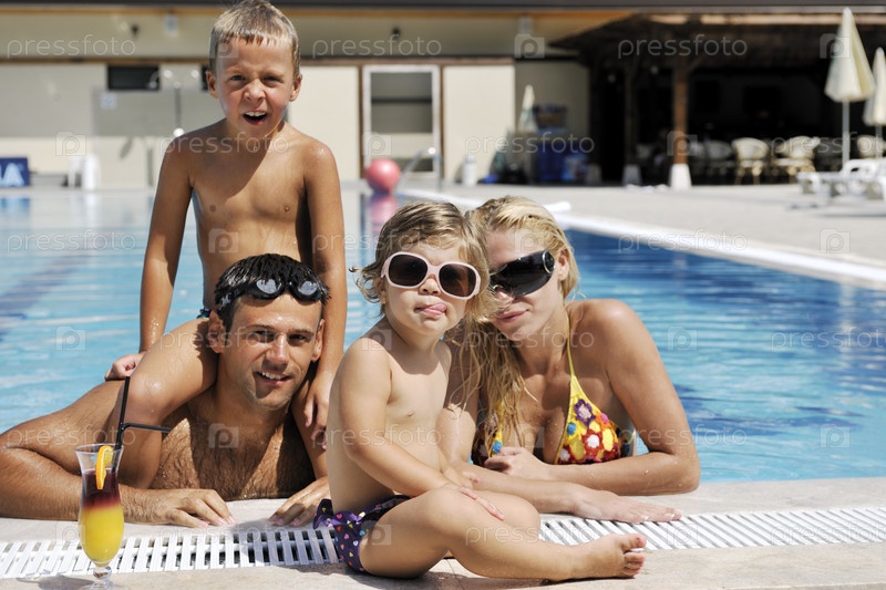 Счастливая молодая семья в бассейне