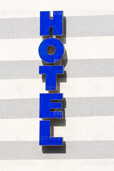 Голубая неоновая вывеска HOTEL (гостиница) на фасаде здания, при