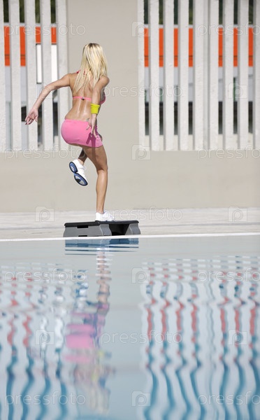 Молодая красивая женщина занимается фитнесом возле плавательного бассейна