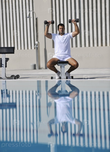 Мужчина выполняет упражнения у бассейна