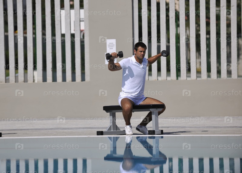 Мужчина выполняет упражнения у бассейна
