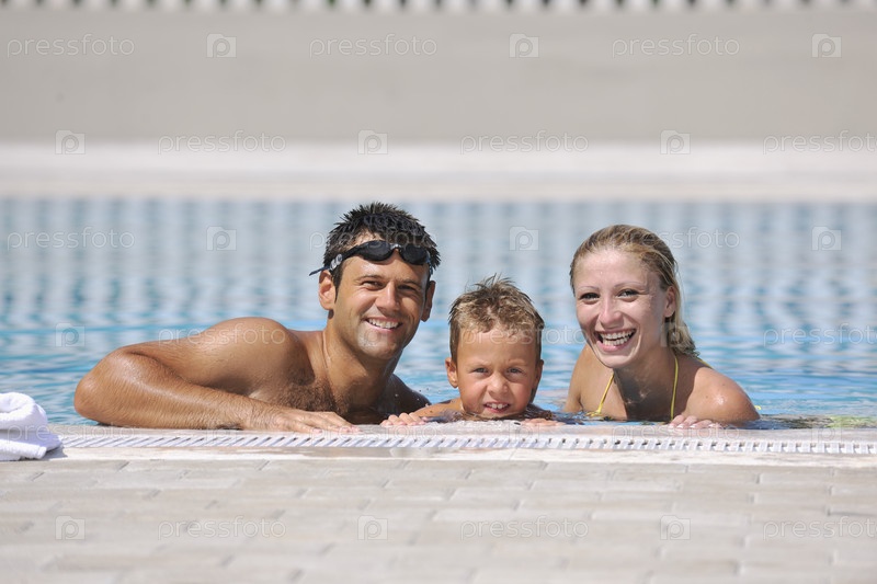 Счастливая семья в бассейне