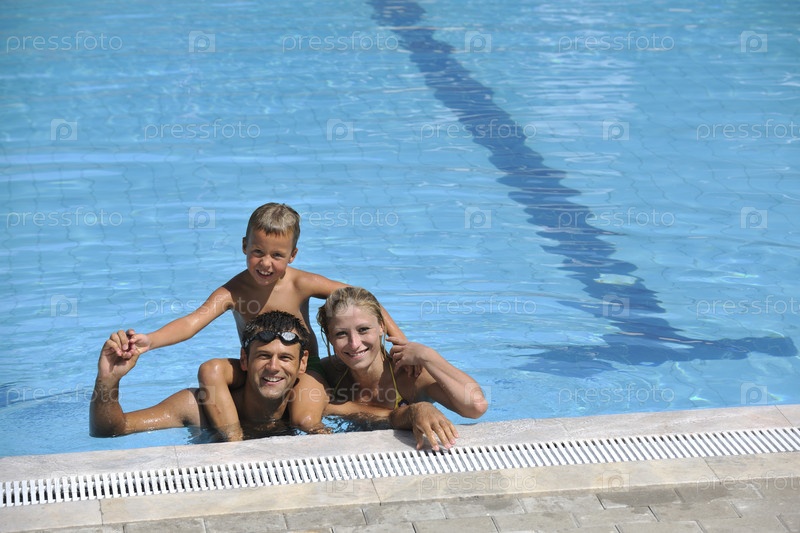 Счастливая семья в плавательном бассейне на открытом воздухе