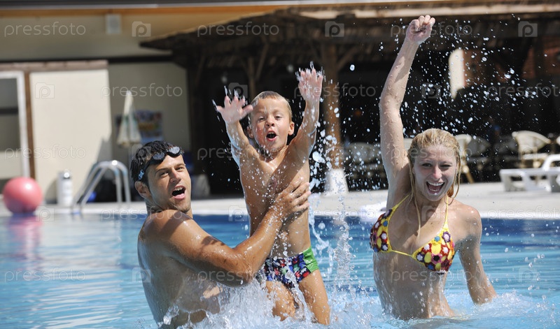 Счастливая семья купается в плавательном бассейне на открытом воздухе