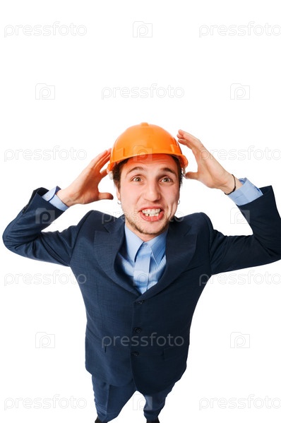 Молодой человек, носящий хардхат изолированный на белом
