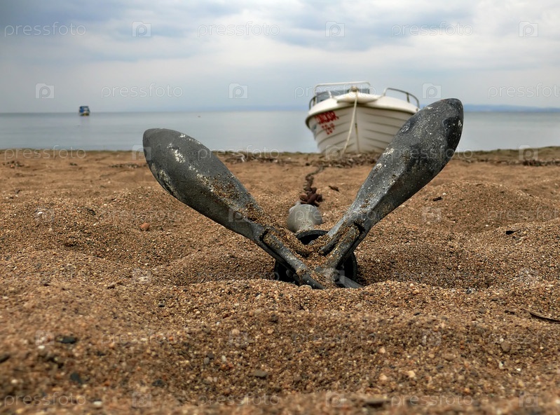 Лодка с якорем на берегу Эгейского моря