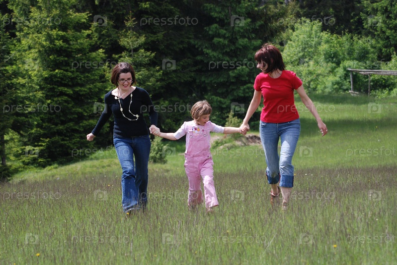 Две девушки с маленькой девочкой на открытом воздухе