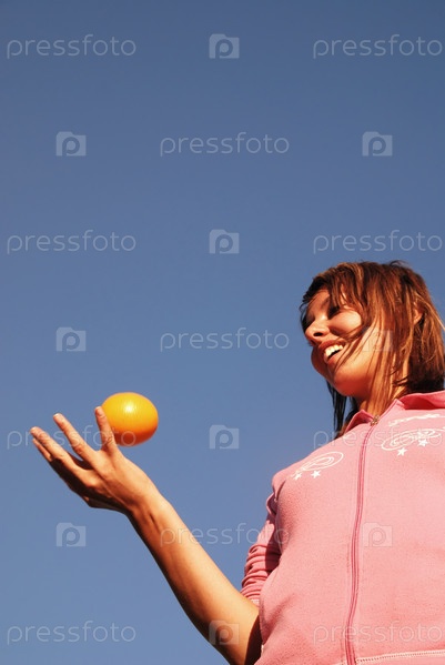 Красивая молодая женщина с апельсином на открытом воздухе