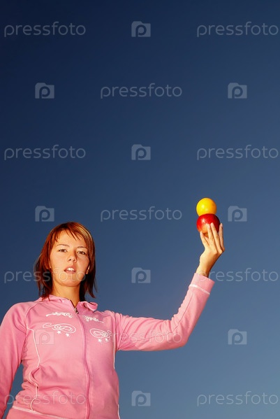 Молодая женщина с фруктами в руке на открытом воздухе