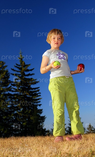 Маленькая девочка с яблоками на открытом воздухе