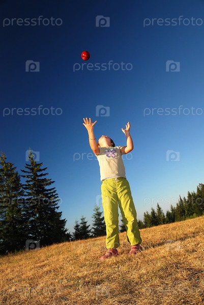 Маленькая девочка подбрасывает яблоко на открытом воздухе