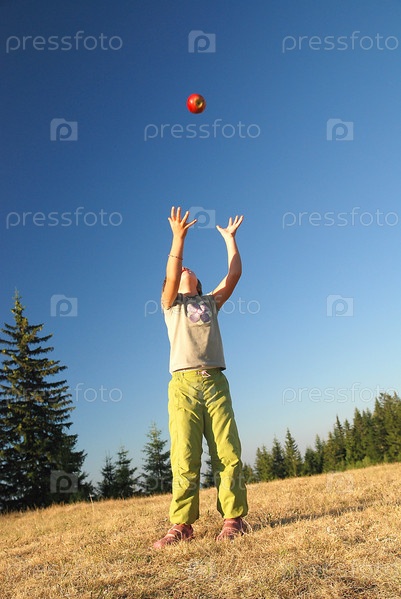 Маленькая девочка подбрасывает яблоко на открытом воздухе