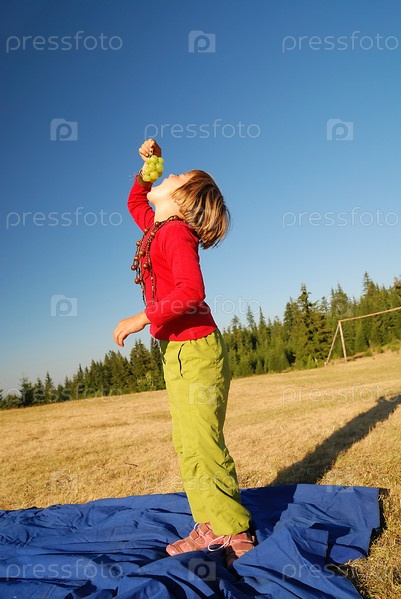Девочка ест виноград на открытом воздухе