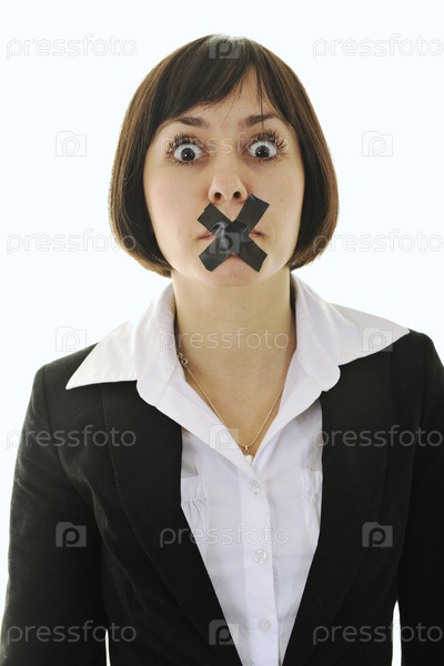 Деловая женщина с заклеенным черной лентой ртом, изолирована на белом фоне