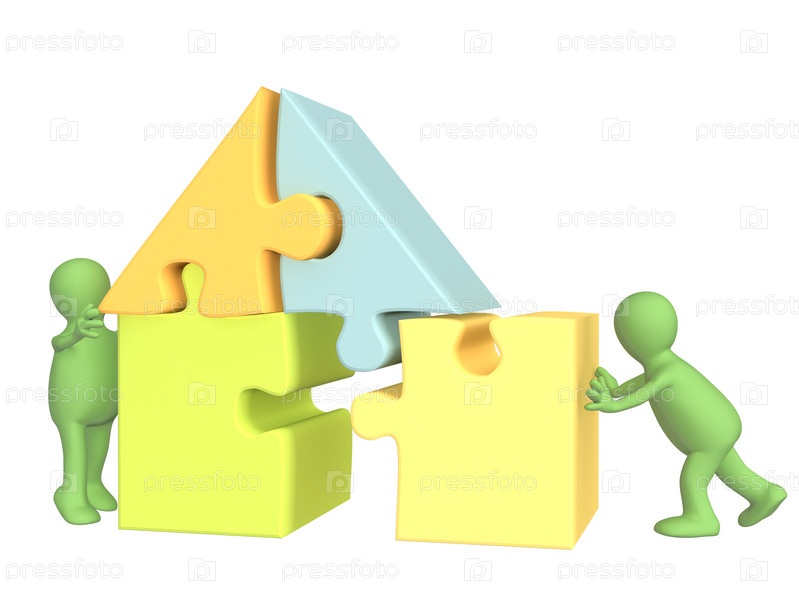 Человек, строящий домик из кусочков головоломки