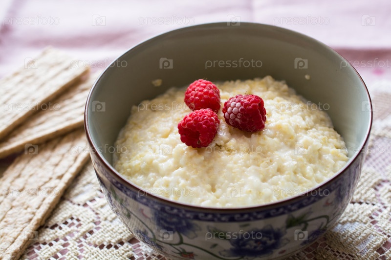 Миска с молочной кашей и ягодами малины