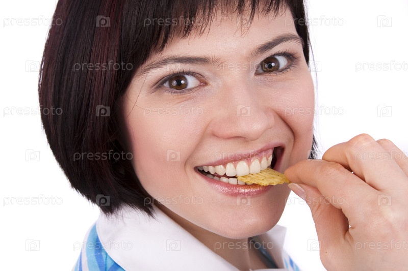 Молодая женщина ест чипсы. Милая девушка ест чипсы. Ест картофельные чипсы / чипсы. Красивая женщина принимает нездоровую закуску, смотря вверх на камеру