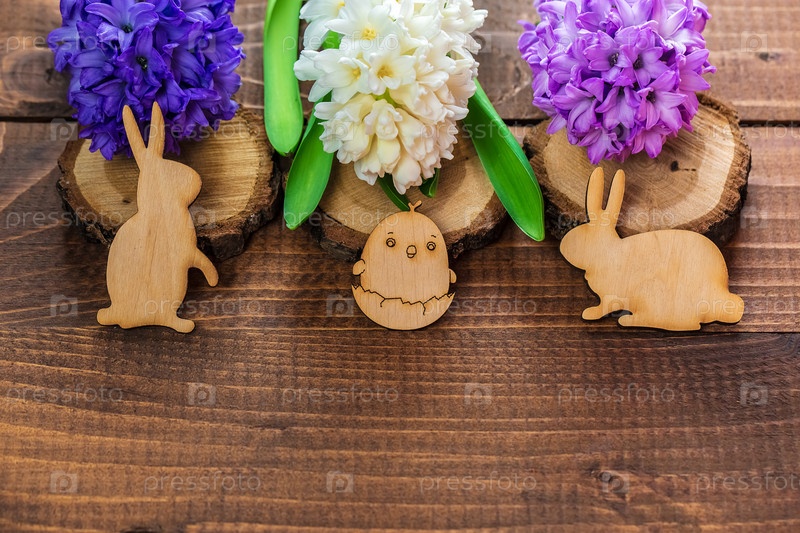 Красивые цветы гиацинта и деревянные кролики