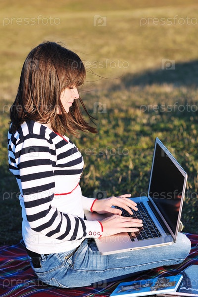 Девушка-подросток с ноутбуком на природе