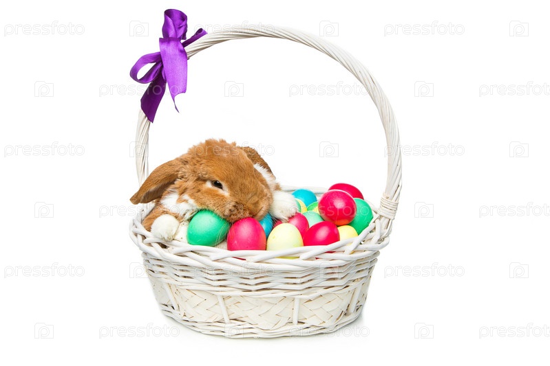 Кролик в корзине с пасхальными яйцами