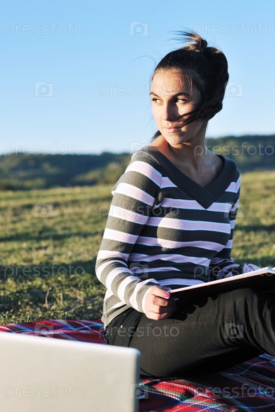 Девушка-подросток делает домашнее задание на природе