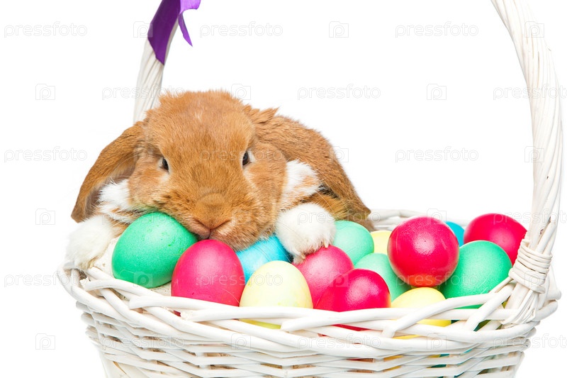 Кролик в корзине с пасхальными яйцами