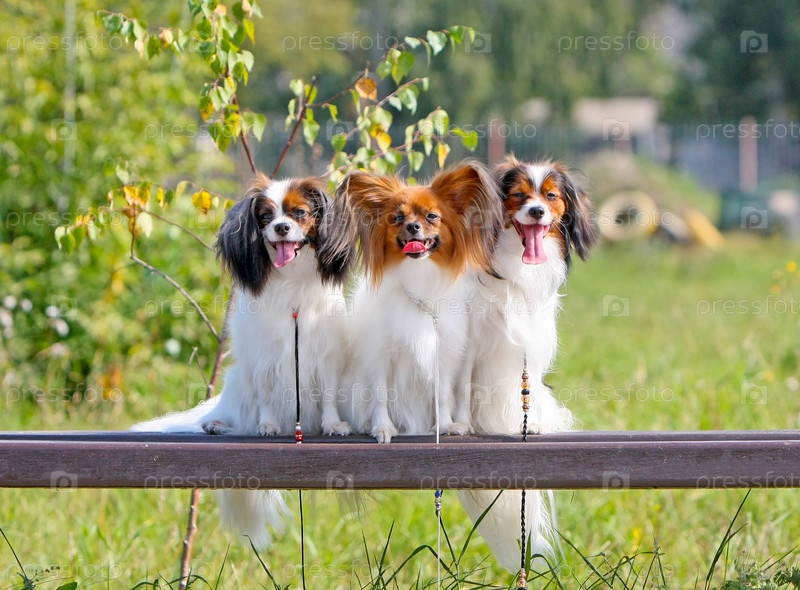 Три красивые бело-рыжие собаки породы папийон и фален