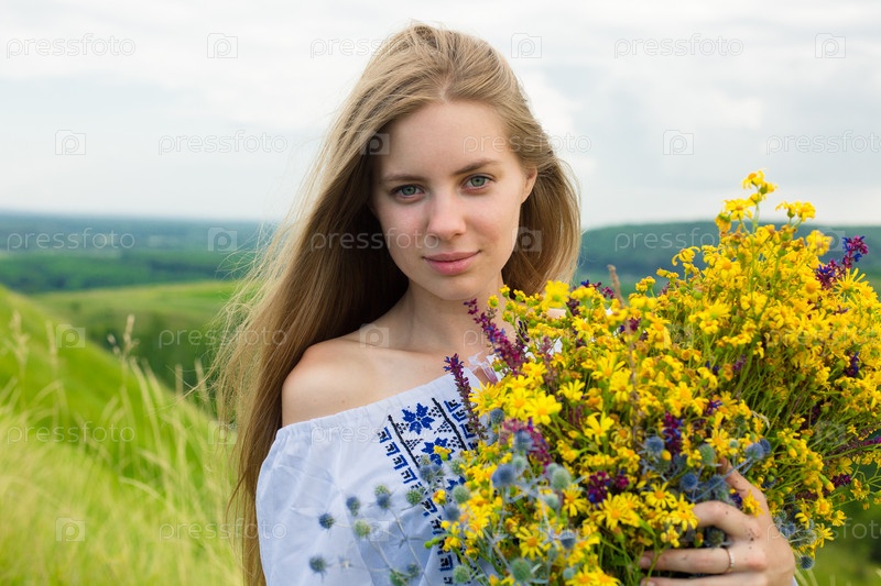 Портрет молодой девушки в поле с цветами