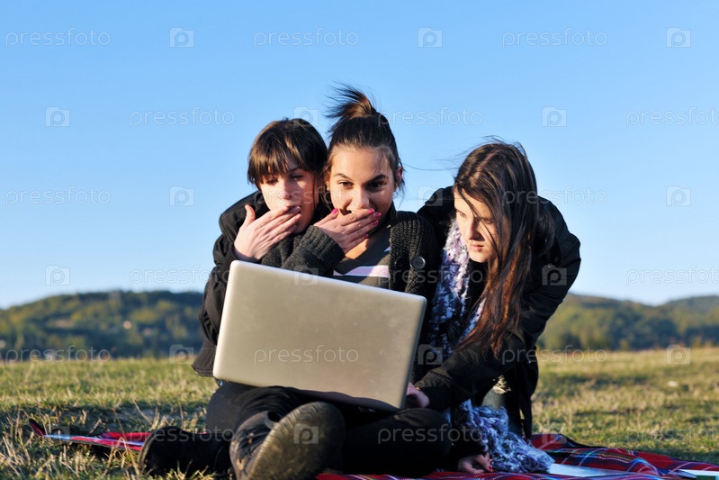 Девушки-подростки с ноутбуком на природе