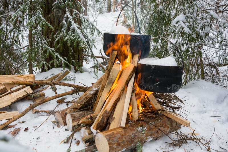 Снег в котлах на костре