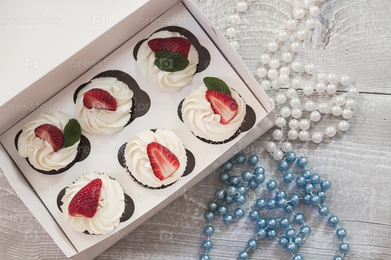 Шоколадные кексы с белым кремом и клубникой