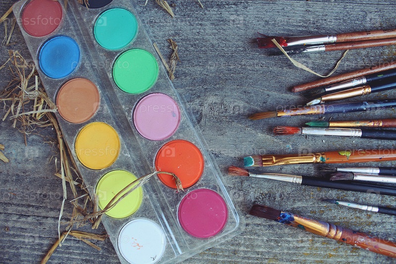 Кисти и краски на столе