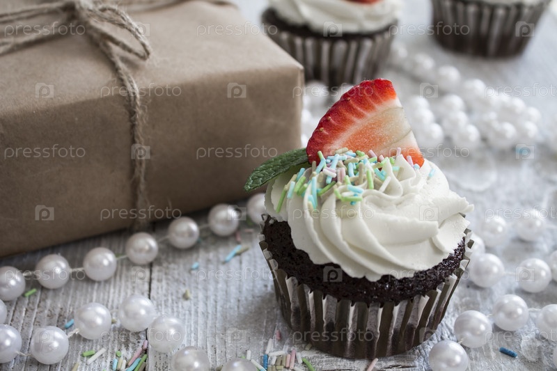 Шоколадные кексы с белым кремом и клубникой