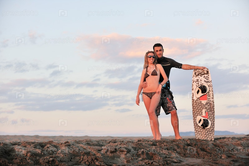 Романтическая пара с доской для серфинга на пляже на закате