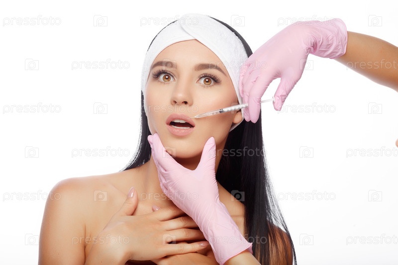 Удивленная молодая женщина получает инъекции в губы