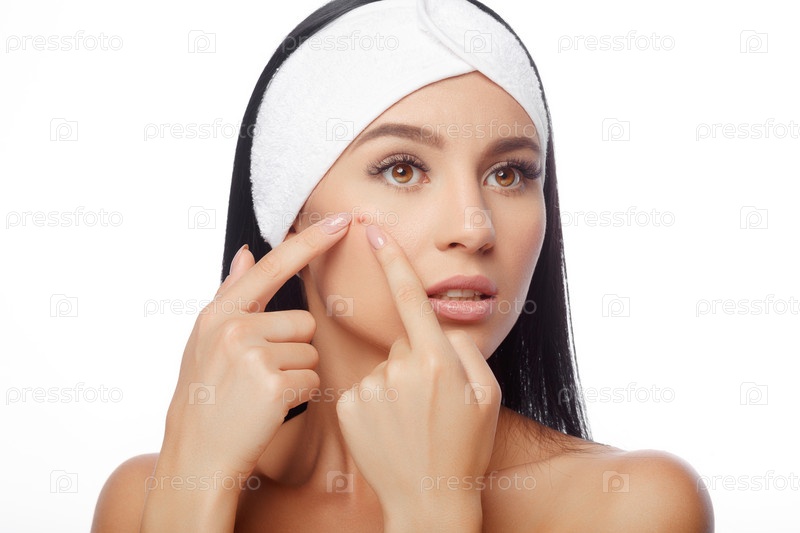 Молодая женщина, сжимая прыщ