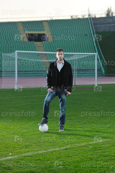 Спортивный менеджер с мячом на стадионе