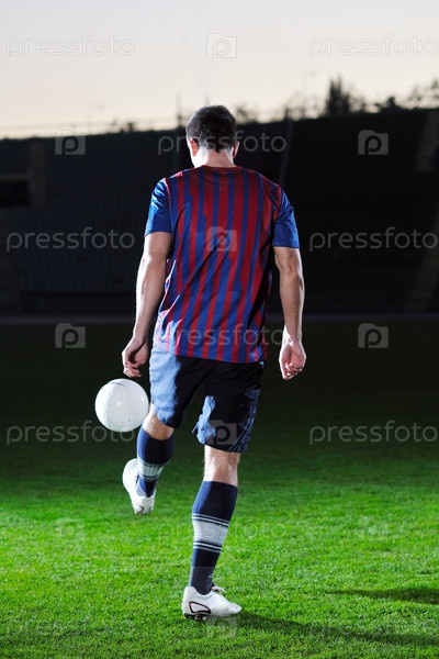 Портрет молодого футболиста с мячом на футбольном поле с зеленой травой ночью