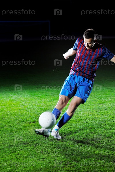 Портрет молодого футболиста с мячом на футбольном поле с зеленой травой ночью