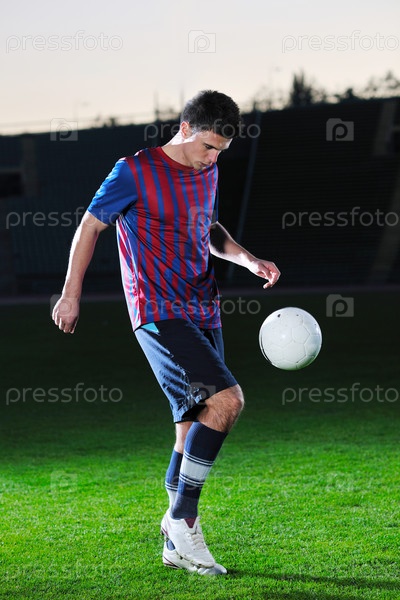 Портрет молодого футболиста с мячом на футбольном поле с зеленой травой ночью