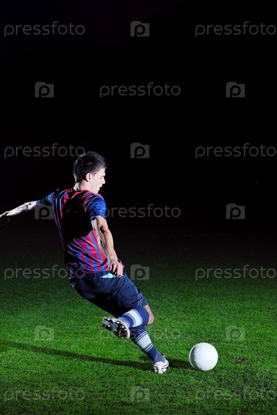 Портрет молодого футболиста с мячом на футбольном поле с зеленой травой ночью