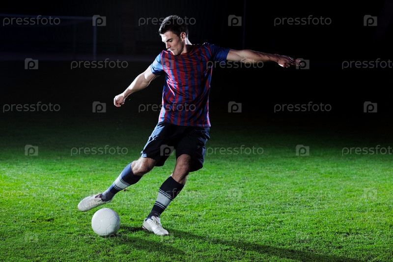 Портрет молодого футболиста с мячом на футбольном поле с зеленой травой ночью