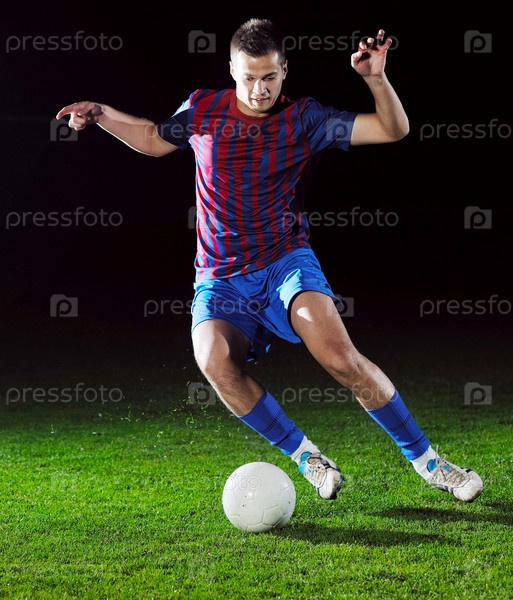Портрет молодого футболиста с мячом на футбольном поле с зеленой травой ночью