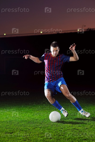 Портрет молодого футболиста с мячом на футбольном поле с зеленой травой ночью