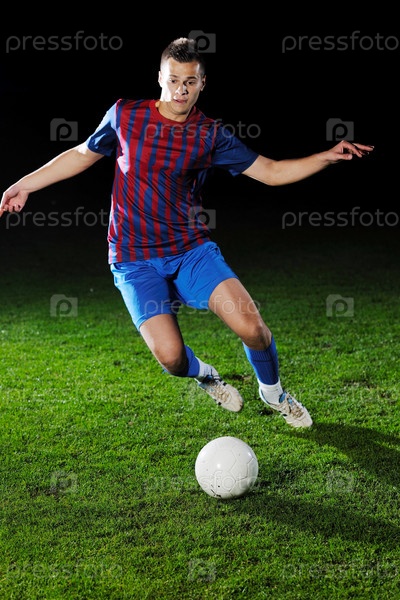 Портрет молодого футболиста с мячом на футбольном поле с зеленой травой ночью