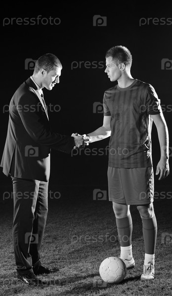 Менеджер в деловом костюме с футболистом на футбольном поле
